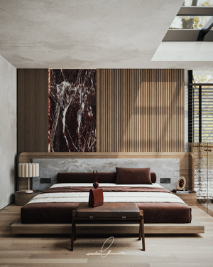 A harmonious blend of texture and tone defines this master suite. Rich chocolate hues meet natural wood and cool concrete in a design that feels both grounded and luxurious. The feature wall—part vertical slats, part marble slab—adds depth and drama, while soft daylight from the skylight above invites rest and retreat.