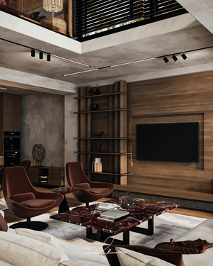 Refined Living & Lounge Area This cozy yet sophisticated living space is anchored by earthy tones and sculptural furniture. Deep rust-colored lounge chairs pair beautifully with a bold marble coffee table, while open shelving and recessed lighting add warmth. A perfectly positioned staircase leads the eye upward, subtly connecting the floors without interrupting the flow.